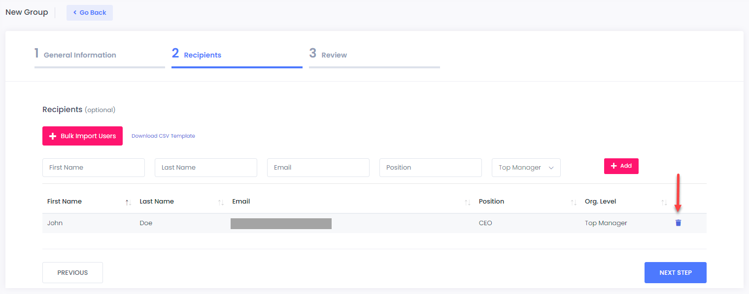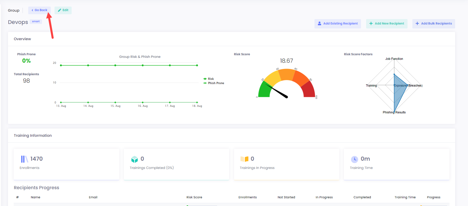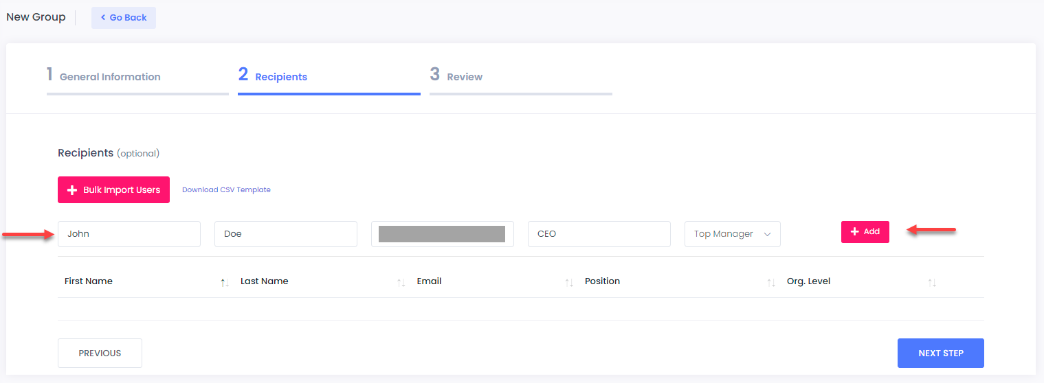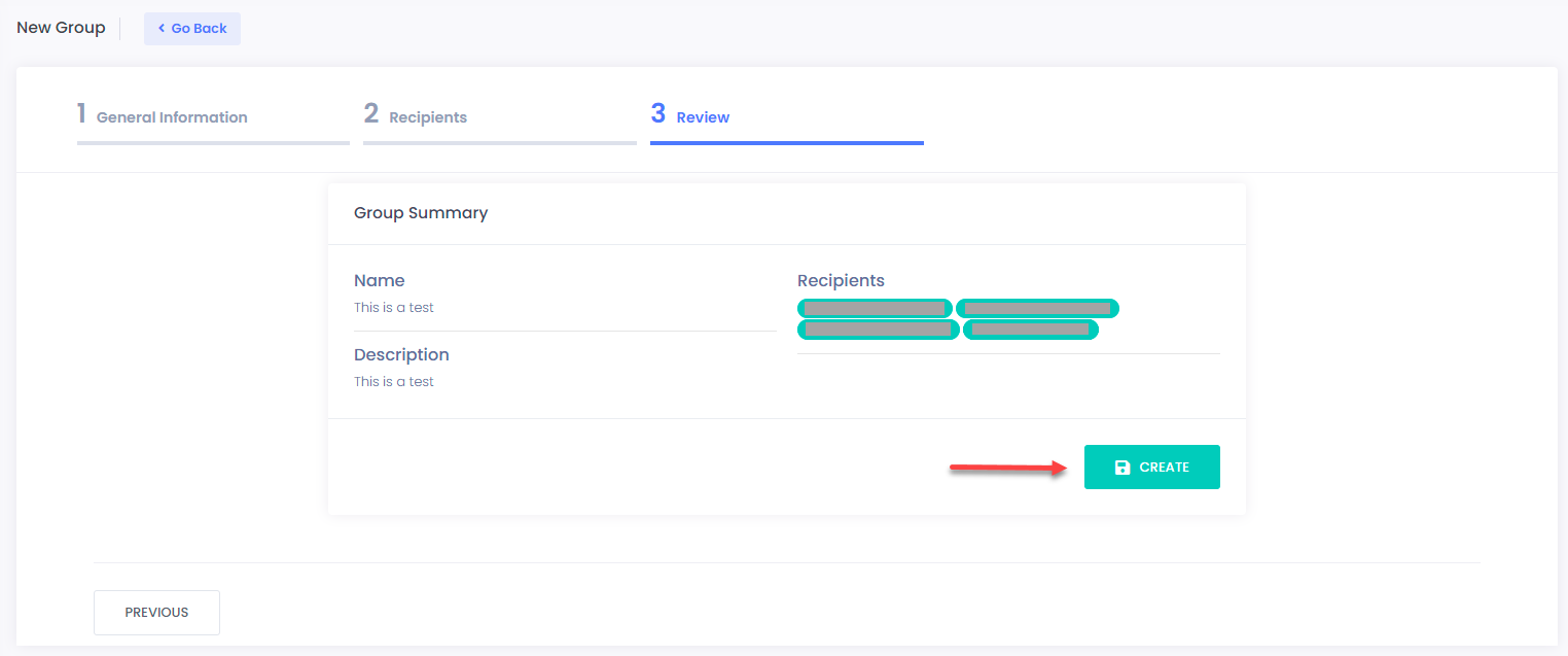 In case that you haven’t entered any recipients during the **Recipients** phase, this will create an **empty** group. You may use this method when creating [Email Campaigns](https://docs.cyberawaresecurity.com/admin-portal/email-campaigns).