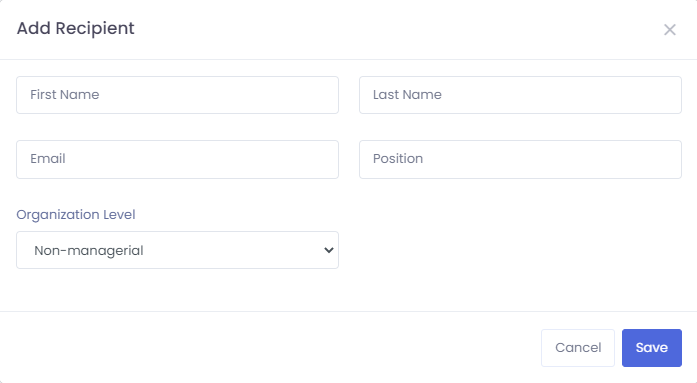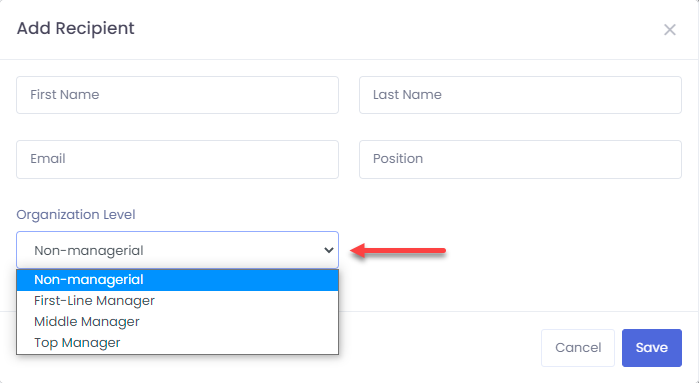 **24.** Add the required details and select the organisation level for that recipient from the drop-down list.
