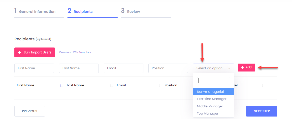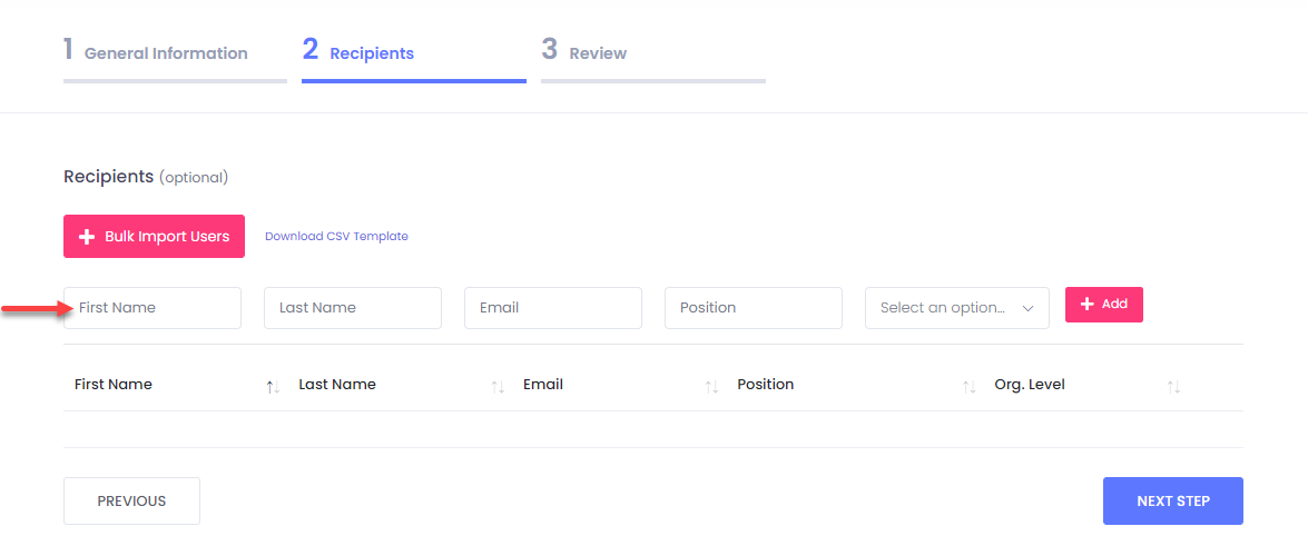 **4.** At the second stage of the process that is recipient related, you have the option to create recipients. This is **optional,** so you can proceed to the **NEXT STEP** accordingly.