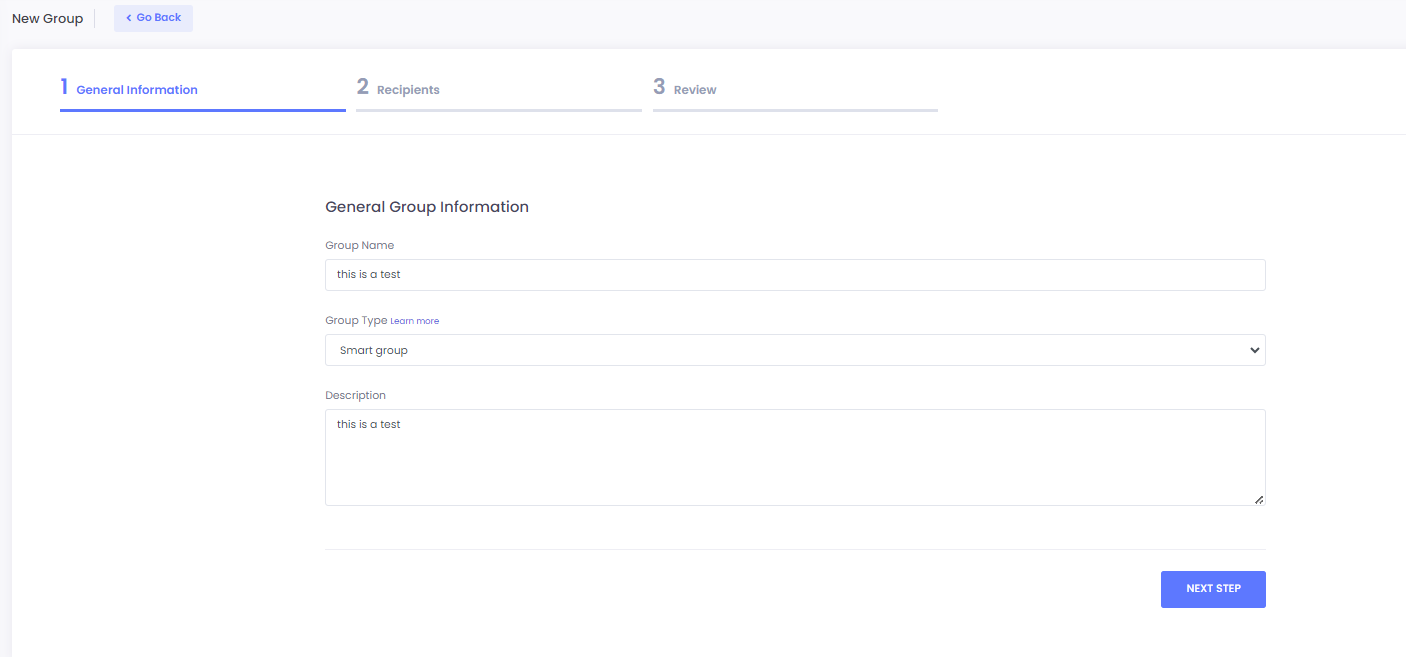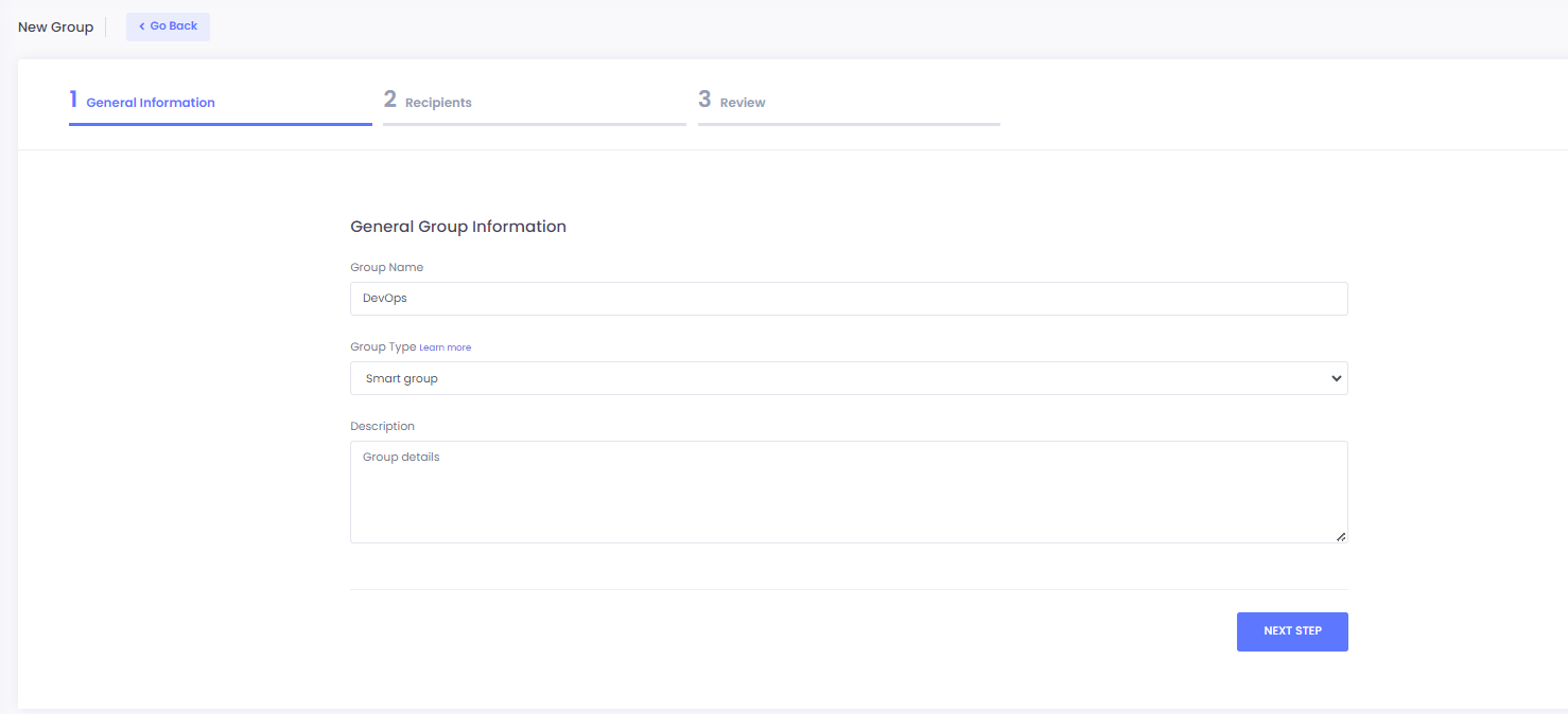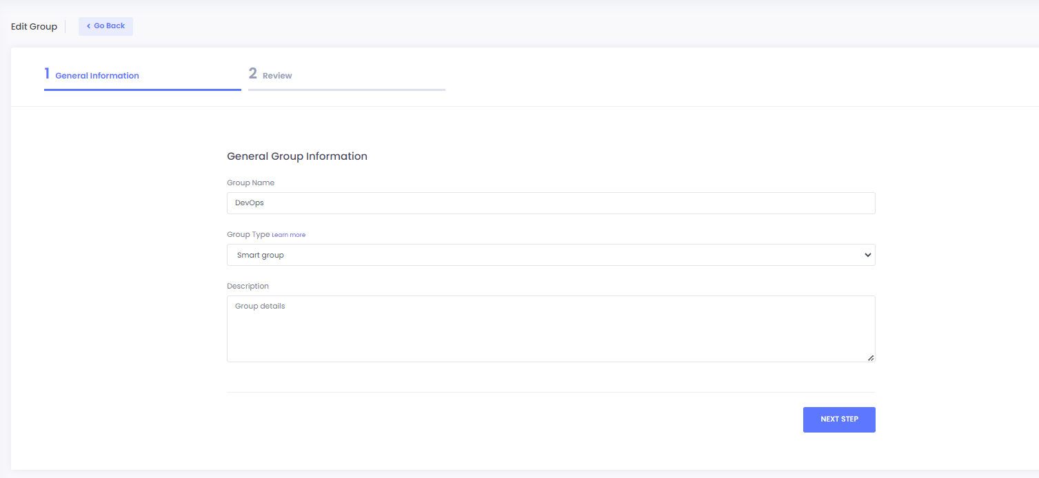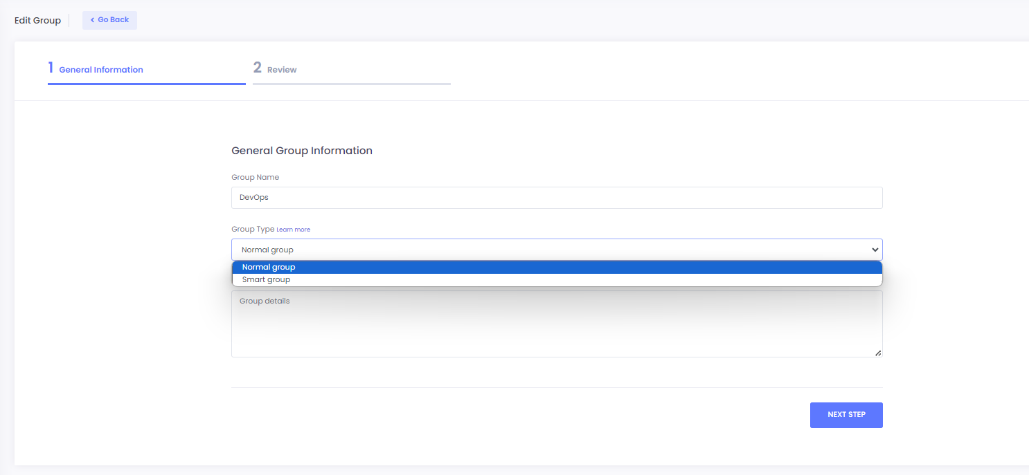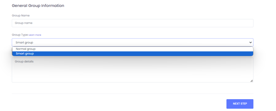 2. Add the group name and description then select **smart group** from group type and click **NEXT STEP** to proceed.