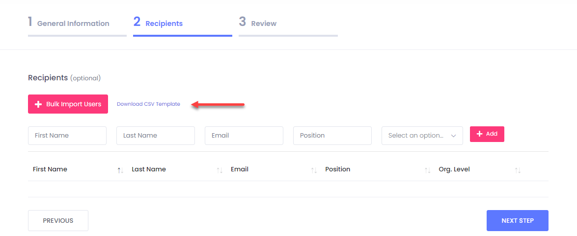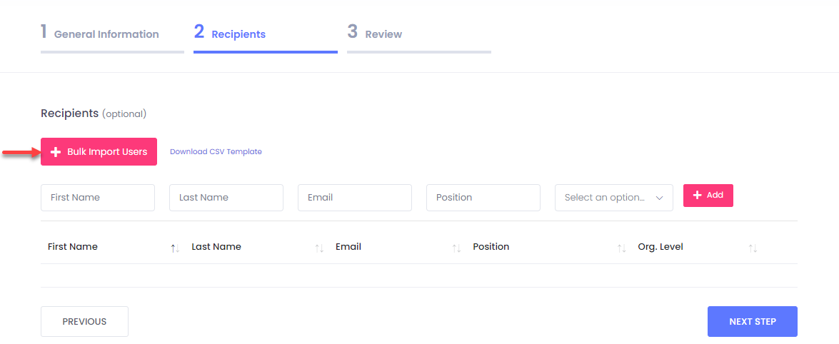 **26.** Alternatively, for larger groups of known people, you can **mass add** users on the platform by importing **CSV** files using the add bulk recipients.