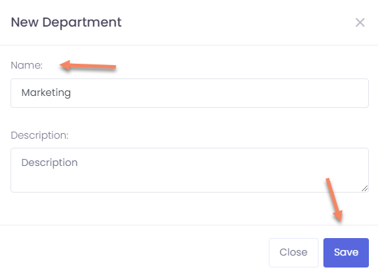3. The above screenshot shows some Departments that have already been created. To create a new Department, click on the button named New Department and complete the Department name and Description. The Description field is optional.