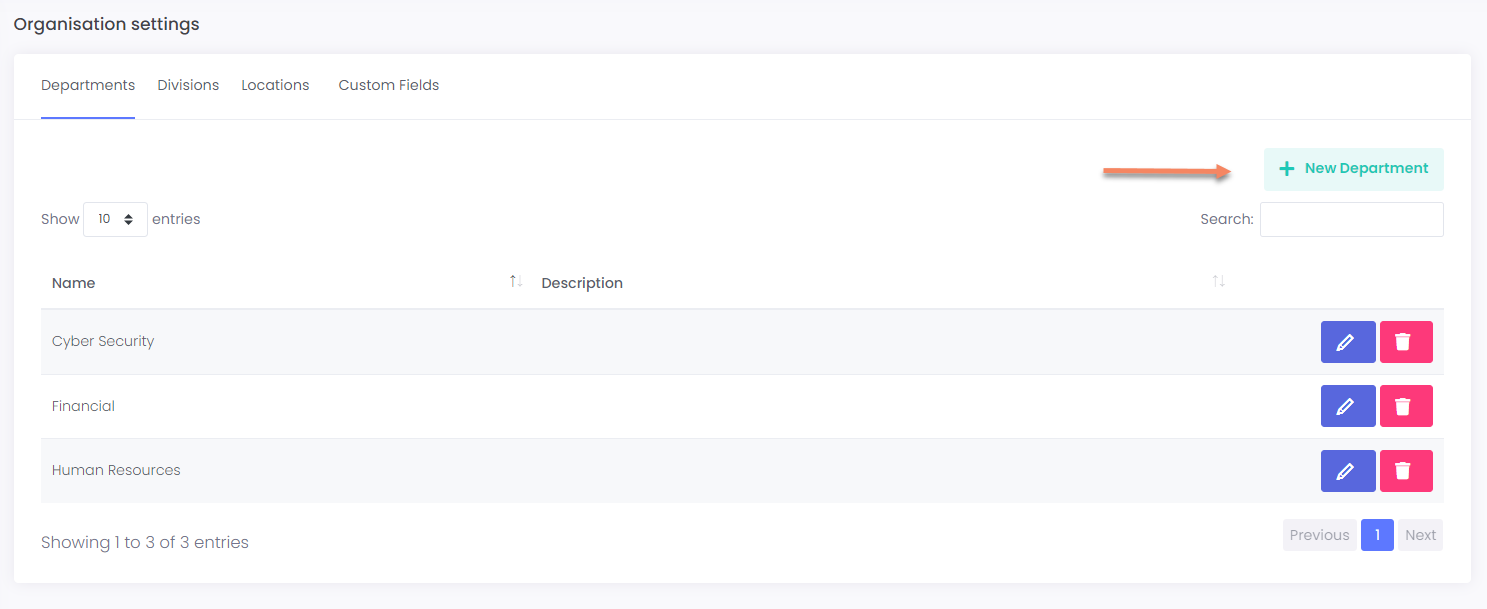In this article, we explain the process of adding organisation fields such as Departments, Divisions and Locations. The admin has also the ability to setup custom fields which can be text boxes or dropdown boxes. By adding such organisation fields you may then specify on Recipients to which Department they belong, which Division and to what Location. Such fields are also available on Phishing Reports to filter out reports based on Location, Department, Division and based on the values of the Custom Fields.
